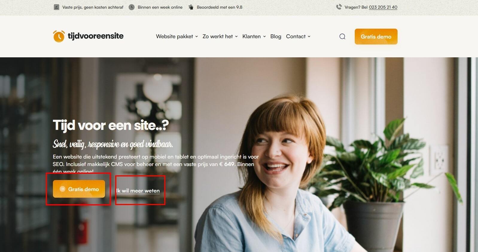 Zowel de button als de call2action gebruik je als oproep om je bezoekers tot actie over te laten gaan. Het verschil zit ‘m in de flexibiliteit. Buttons kun je plaatsen op elke gewenste pagina in paginabeheer, blogartikelen en zelfs in slides. Op de website van Tijdvooreensite gebruiken we ook buttons. Dat ziet er zo uit: